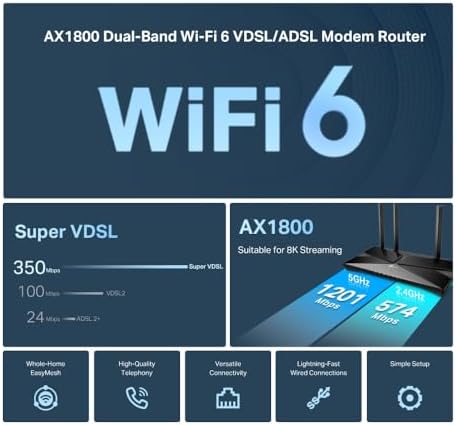 VX1800v, AX1800 Mbps Çift Bantlı Fiber Destekli Wi-Fi 6 VDSL/ADSL Modem Router, 4 Gigabit LAN Portları + 1 USB 2.0 Port, MU-MIMO, Super VDSL, Uygulaması ile Kolay Kurulum