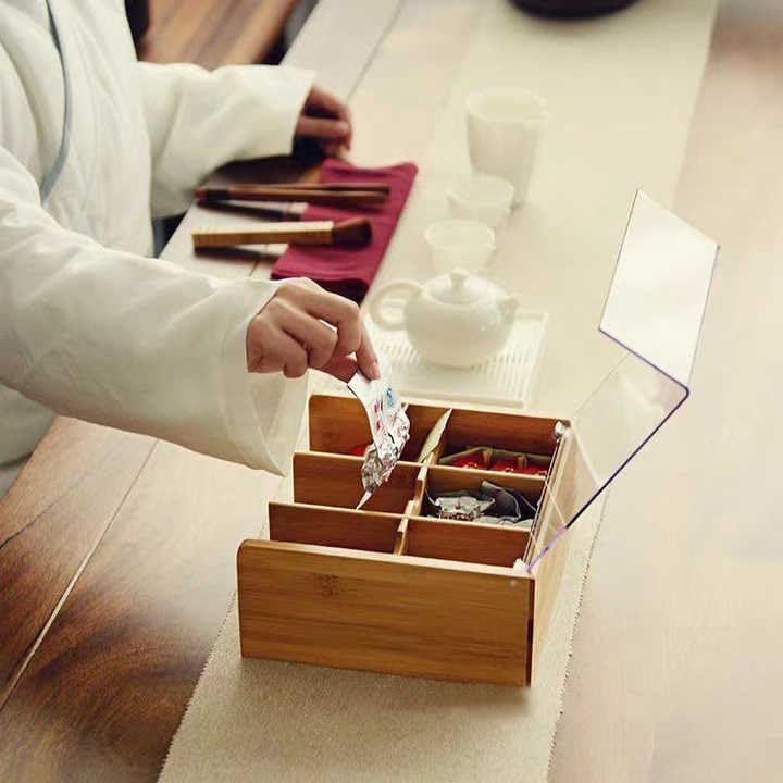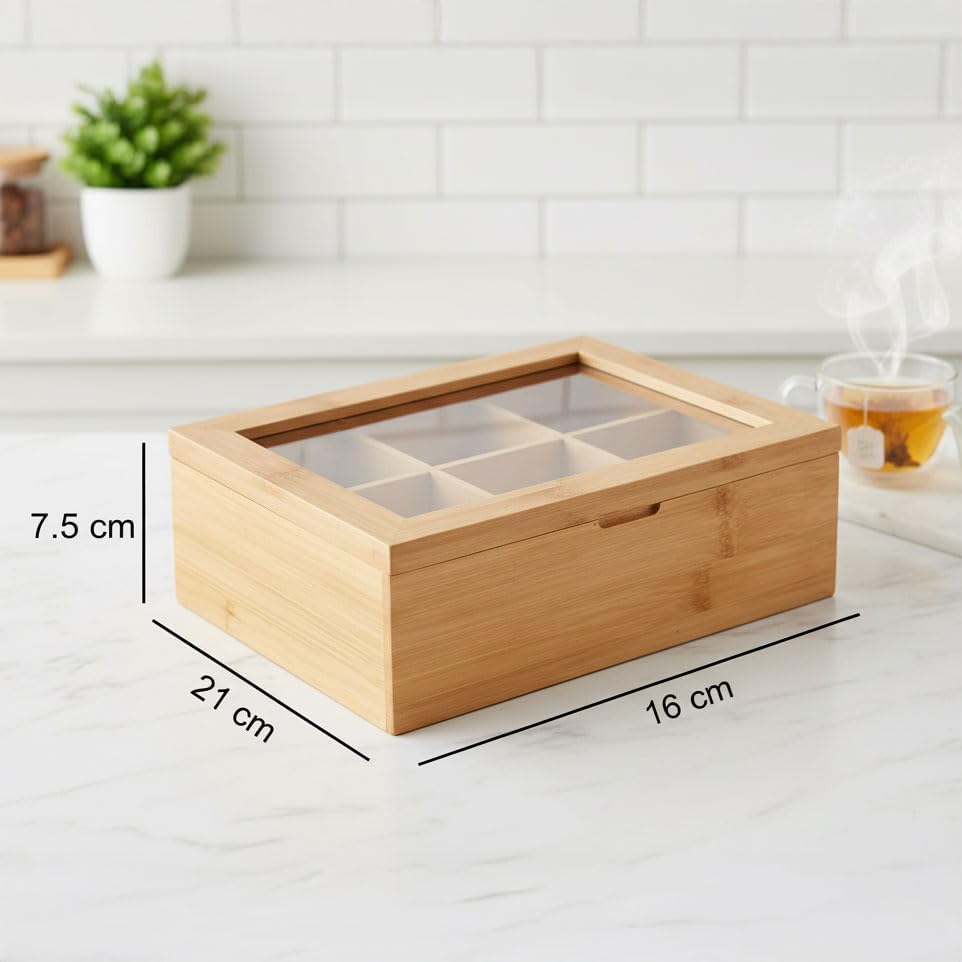 Akrilik Şeffaf Kapaklı Bambu 6 Bölmeli Çay Kutusu -%100 Orjinal Bambu Şeffaf Kapak (22cm*22cm*10cm)