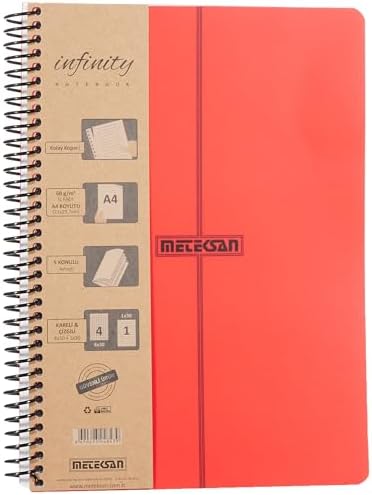 Primary Serisi, A4, 5 Konulu (4 Kareli, 1 Çizgili) 150 Yaprak PP Kapaklı Spiralli Defter, Kırmızı