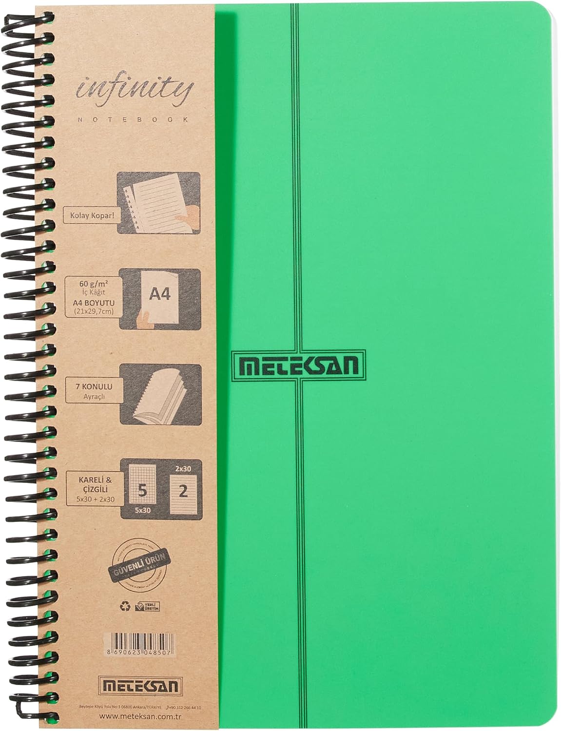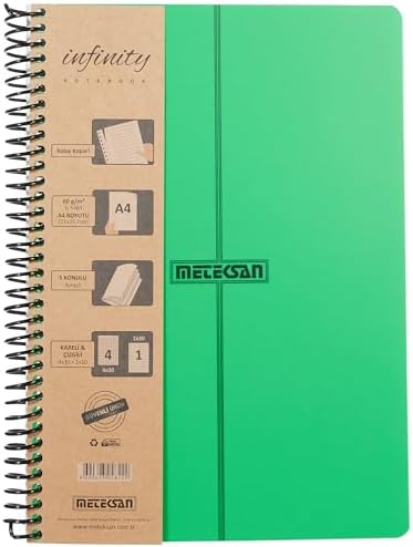 Primary Serisi, A4, 7 Konulu (5 Kareli, 2 Çizgili) 210 Yaprak PP Kapaklı Spiralli Defter, Yeşil