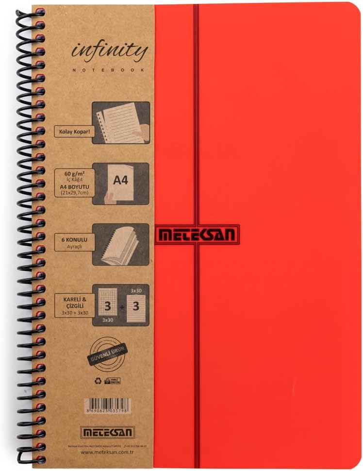 Primary Serisi, A4, 6 Konulu (3 Kareli, 3 Çizgili) 180 Yaprak PP Kapaklı Spiralli Defter, Kırmızı