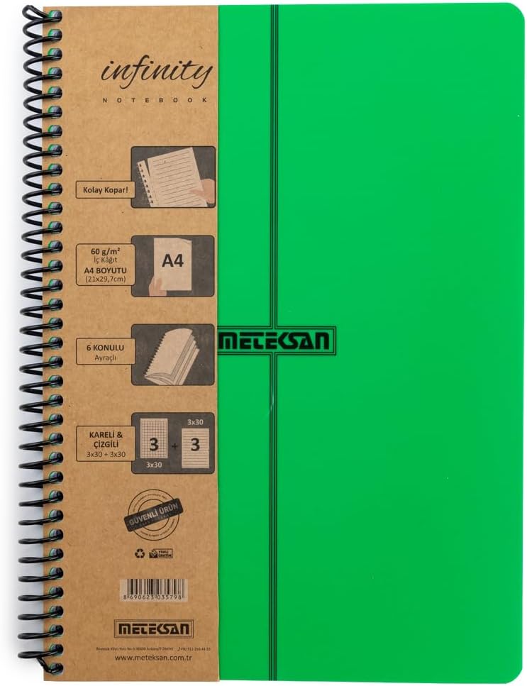 Primary Serisi, A4, 6 Konulu (3 Kareli, 3 Çizgili) 180 Yaprak PP Kapaklı Spiralli Defter, Yeşil