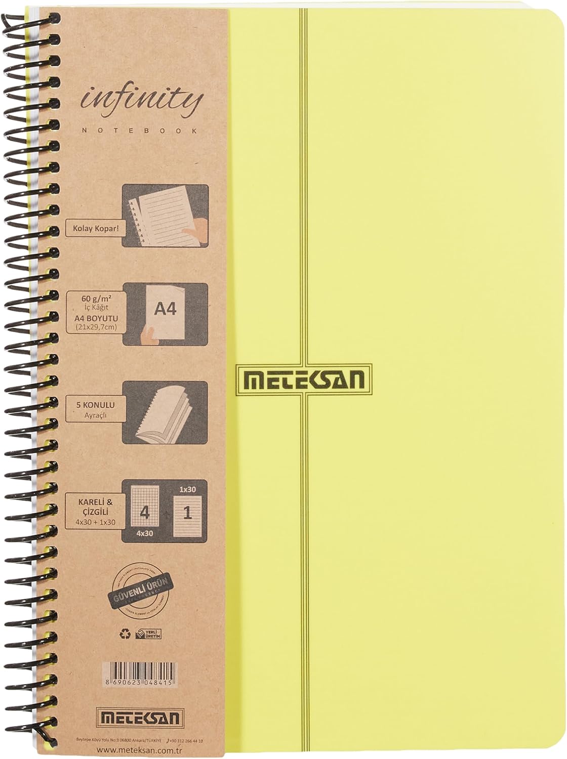 Primary Serisi, A4, 5 Konulu (4 Kareli, 1 Çizgili) 150 Yaprak PP Kapaklı Spiralli Defter, Sarı