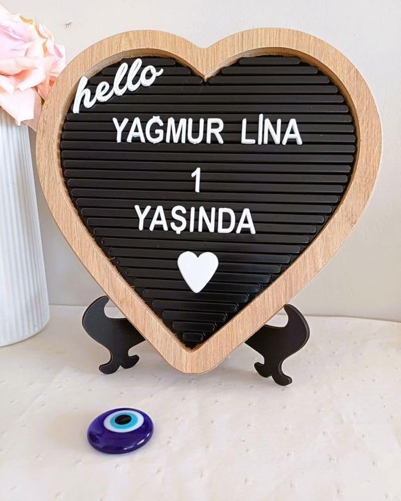 Ahşap Kalp Çerçeveli Özelleştirilebilir Mesaj Panosu Siyah Zemin Beyaz Harf Setli Yazı Tahtası