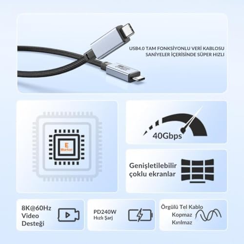 1Mt E-Marker Çip Thunderbolt USB4.0 PD 240W Şarj Kablosu 8K 60hZ Görüntü Aktarım 40Gbps