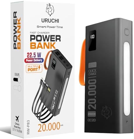 22.5W PD 3.0 Hızlı Şarj Powerbank, Kablolu Model, Gerçek 20.000 mAh Kapasite, 15/16 Serisi ile Type-C Uyumlu, QC2.0 Destekli Taşınabilir Şarj Cihazı, Siyah