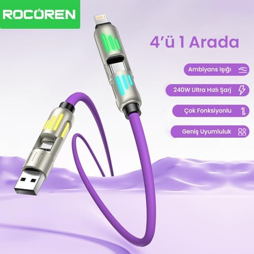 240W 4'ü 1 Arada Type-C/USB-A/Lightning Mor Silikon Şarj ve Data Kablosu 1.2 Metre