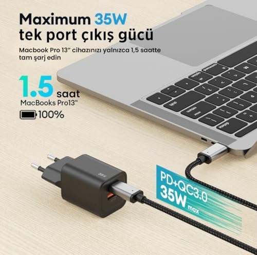 HIZLI ŞARJ: 35W PD+QC3.0 teknolojisi ile Pro 13″ cihazınızı sadece 1,5 saatte tam şarj edebilirsiniz ÇİFT PORT: USB ve Type-C portları sayesinde aynı anda iki cihazı şarj etme imkanı sunar UYUMLULUK: Pro ve diğer USB-C destekli cihazlarla tam uyumlu çalışır GÜÇ ÇIKIŞI: Maksimum 35W güç çıkışı ile hızlı ve güvenli şarj sağlar KOMPAKT TASARIM: Hafif ve taşınabilir yapısı ile seyahatlerinizde yanınızda kolayca taşıyabilirsiniz 35W PD+QC3.0 Hızlı Şarj Adaptörü, Uyumlu 1.5 Saat Şarj Süresi, USB ve Type-C Portlu