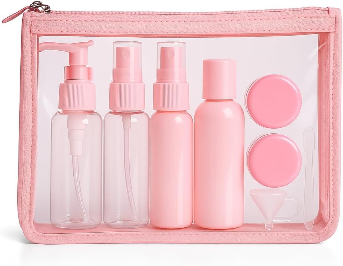 9 Parça Bej Seyahat Seti – Doldurulabilir Boş Şişe ve Krem Kutusu Seti | Şeffaf Çantalı, Uçak Kabin Onaylı (Pembe)