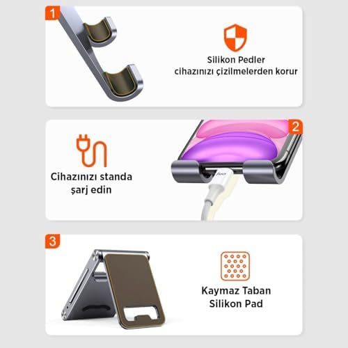 metal masaüstü telefon standı, yüksek kaliteli alüminyum alaşımdan üretilmiş dayanıklı ve şık bir metal telefon tutacağıdır. Ergonomik tasarımı ve kaymaz silikon pedleriyle tüm akıllı telefonlar için ideal bir masaüstü aksesuarıdır. Üstün Malzeme Kalitesi Premium alüminyum telefon tutucu, dayanıklı metal yapısı ve özel kaymaz silikon pedleriyle telefonunuzu güvenle tutar. Masaüstü telefon tutacağı, yüksek kaliteli malzemesiyle uzun ömürlü kullanım sağlar. Evrensel Uyumluluk Metal telefon tutacağı, tüm akıllı telefon modelleriyle uyumlu olup, geniş tutuş açısı sayesinde ideal görüntüleme deneyimi sunar. Cep telefonu tutucu standı, 120mm x 77mm x 29mm boyutlarıyla kompakt bir tasarıma sahiptir. Ergonomik Tasarım Masaüstü telefon tutucu, ergonomik açısı sayesinde video izleme, görüntülü görüşme ve masa üstünde rahat kullanım sağlar. Alüminyum telefon tutucu, modern ofis malzemeleri arasında şık görünümüyle öne çıkar. Sıkça Sorulan Sorular Telefonumu güvenle tutar mı? 194 gram ağırlığındaki sağlam metal yapısı ve kaymaz silikon pedleri sayesinde telefonunuzu güvenle tutar. Hangi telefon modelleriyle uyumlu? Evrensel tasarımı sayesinde tüm akıllı telefon modelleriyle uyumludur. Masa üzerinde kayar mı? Altında bulunan kaymaz silikon pedler sayesinde masa üzerinde sabit durur. Ürün Özellikleri Malzeme: Alüminyum alaşım + silikon Ağırlık: 194g Boyutlar: 120*77*29mm Renk: Uzay Grisi Evrensel uyumluluk: Tüm telefon modelleri için Kaymaz silikon pedler Şık ve sade tasarım Kutu İçeriği 1 x Juo Alüminyum Masaüstü Telefon Standı 1 x Kullanım Kılavuzu Alüminyum Katlanabilir Metal Masaüstü Telefon Tutucu Standı Gümüş