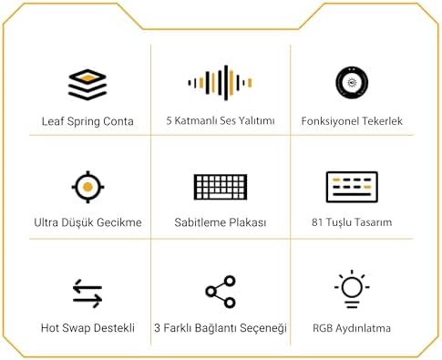Aula AU75 3 Modlu RGB Hot Swap Mekanik TKL Seiya Switch Kablosuz Makrolu Klavye Bej, oyuncuların ve profesyonellerin tüm ihtiyaçlarını karşılayacak şekilde tasarlanmıştır. %75 boyutunda kompakt ve işlevsel yapısıyla masa üzerindeki alanı optimize ederken, üstün performans ve ergonomik kullanım sunar. Klavyenin dikkat çeken özellikleri arasında 81 tuş düzeni, yüksek kaliteli LEOBOG Seiya switch’ler ve çift katlı aşınmaya dayanıklı PBT tuş kapakları bulunuyor. Hot-swappable özelliği sayesinde, switch'lerinizi kolayca değiştirerek klavyenizi tamamen kişiselleştirebilirsiniz. Teknik Özellikler soft elastik gasket yapısı ve beş katmanlı ses yalıtım dolgusu sayesinde yazma ve oyun deneyimi sırasında saf bir tuş sesi elde edersiniz. Klavyenin PCB positioning plate tasarımı ve tek tuş slotted PCB’si hem dayanıklılık hem de performans açısından üstün bir yapı sunar. Çok Fonksiyonlu Kontrol Tekerleği Aula AU75’in sağ üst köşesinde bulunan geliştirilmiş çok işlevli kontrol paneli, ses seviyesi ve RGB ışık efektleri arasında kolayca geçiş yapmanızı ve bağlantı seçeneklerini değiştirmenizi sağlar. FN tuşu ile F1 tuşlarındaki multimedya işlevlerini kullanabilir, FN + yön tuşlarıyla 17 farklı RGB ışık efektini yönetebilirsiniz. 16.8 milyon renk seçeneği sunan RGB aydınlatma, klavyenizi tamamen kişiselleştirmenize imkan tanır. Üçlü Bağlantı Farklı Modu ve Uzun Batarya Ömrü Klavyenin Bluetooth 5.0, 2.4GHz kablosuz dongle ve Type-C kablolu bağlantı olmak üzere üç farklı bağlantı modu bulunur. Aynı anda altı farklı cihaza bağlanabilir ve cihazlar arasında hızlıca geçiş yapabilirsiniz. DC 5V şarj voltajına sahip 4000mAh batarya kapasitesi, ışık efektleri açıkken yaklaşık 22 saat, ışıklar kapalıyken ise 266 saat kesintisiz kullanım sağlar. Type-C şarj bağlantısı, hızlı ve stabil bir şarj imkanı sunar. Ergonomik ve Dayanıklı Tasarım 336.34 mm x 147.30 mm x 44.31 mm boyutlarındaki kompakt tasarımı ve 977.3 g ağırlığı ile taşınabilirlik sağlar. Çift katmanlı PBT tuş kapakları uzun süreli kullanımlarda bile solma yapmaz ve dayanıklılığını korur. Alt kısımda bulunan kaymaz silikon pedler ve iki kademeli ayarlanabilir ayaklar, klavyenin sabit durmasını ve en rahat kullanım açısını bulmanızı sağlar. İç Katmanlar Klavyenin iç yapısında kullanılan beş katmanlı ses yalıtım dolgusu, PO ses pamuğu ve IXPE izolasyon gibi özellikler, yazma ve oyun sırasında üstün konfor sağlar. PCB positioning plate ve açık kalıp silikon tabanı, klavyeye ekstra dayanıklılık kazandırır. Gelişmiş makro programlama desteği Kullanıcılarına hem oyun hem de iş süreçlerinde üst düzey bir kişiselleştirme deneyimi sunar. Bu özellik sayesinde, karmaşık komut dizilerini tek bir tuşa atayabilir, sık tekrarlanan işlemleri hızla gerçekleştirebilirsiniz. Kullanıcı dostu arayüzü, makro ayarlarını kolayca yapılandırmanıza olanak tanırken, kişiselleştirilmiş tuş atamaları ile oyun performansınızı artırabilir ve iş akışınızı optimize edebilirsiniz. Uyumluluk ve Kullanıcı Dostu Kutu İçeriği Aula AU75 mekanik klavye, Windows XP/7/8/10/11, MacOS, ve iOS işletim sistemleri ile tam uyumludur. Her ortamda sorunsuz çalışma garantisi sunar. Teknik Özellikler Model: AU75 Klavye Tipi: İngilizce Q / Mekanik / TKL (Tenkeyless) Tuş Sayısı: 81 Switch Markası: LEOBOG Seiya Switch Türü: Linear Renk: Bej / Lila / Bordo Ürün Boyutları: 336.34(L) x 147.30(W) x 44.31(H) mm Ürün Ağırlığı: 977.3 g Aula AU75 3 Modlu RGB Hot Swap Mekanik TKL Seiya Switch Kablosuz Makrolu Klavye Bej