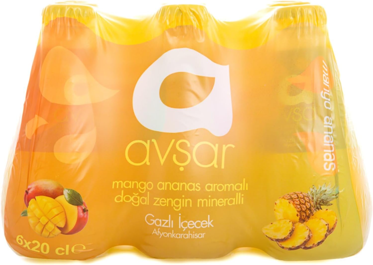 Mango ve ananas aroması içerir Altı adet iki yüz mililitre şişe içerir TSE standartlarında üretilmiştir Avşar Mango ve Ananas Aromalı Maden Suyu 200 ml 6'lı
