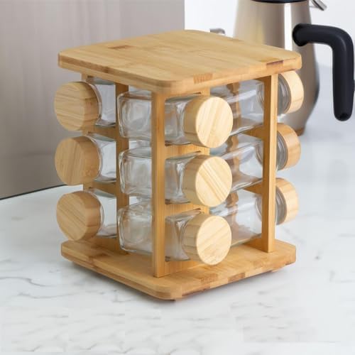 Bambu Döner Standlı Baharat Seti 13 Parça, Mutfak Tezğahına Uygun Bambu Yer Kaplamayan Cam Şişe Dönerli Bambu Baharatlık (Kare)