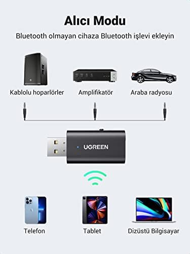 Bluetooth 5.4: Bluetooth 5.4 teknolojisi, Bluetooth ses performansını artırabilir. Bluetooth 5.3 ile karşılaştırıldığında Bluetooth 5.4 daha sağlam ses aktarımı, daha düşük ses gecikmesi ve daha iyi parazit azaltma sağlar. 2'si 1 arada Bluetooth verici ve alıcı: Bluetooth jak adaptörü hem kulaklığa verici fonksiyonu (TX) hem de stereo sistemde alıcı fonksiyonu (RX) aracılığıyla ses aktarımını destekler. Verici, geniş kullanım ve senaryolar için pratik olarak geliştirilmiştir. Bluetooth verici jakı: TX modunda bir cihaz, örneğin Bluetooth özelliği olmayan bir televizyon, Bluetooth fonksiyonu ile donatılmıştır, böylece bir Bluetooth kulaklık veya Bluetooth stereo sistemi ile eşleştirilebilir. Bluetooth alıcısı Aux: RX modu, Bluetooth özellikli olmayan bir cihazın, örneğin Bluetooth fonksiyonu ile donatılmış bir stereo sistemi, böylece Bluetooth özellikli bir cihaz ile donatılmıştır, örneğin müzik çalmak için bir cep telefonu veya tablet ile eşleştirilebilir. RX modunda iki cihaz aynı anda bağlanır: Bluetooth adaptörü Auto Aux ile araç radyosu 3,5 mm jak ile arka arkaya birden fazla akıllı telefona bağlanabilir, adaptör her seferinde otomatik olarak son iki Bluetooth cihazına bağlanır. Uyarı: Ürünü arabada kullanmak için alıcı moduna (RX) getirilmeli ve aynı zamanda USB A güç kaynağı bağlantısına ve 3,5 mm Aux bağlantısına bağlanmalıdır. pro 2/ 4 ve piyano, gitar gibi müzik aletleri ile uyumlu değildir Bluetooth 5.1 3.5mm Aux Alıcı Verici Bluetooth Adaptörü