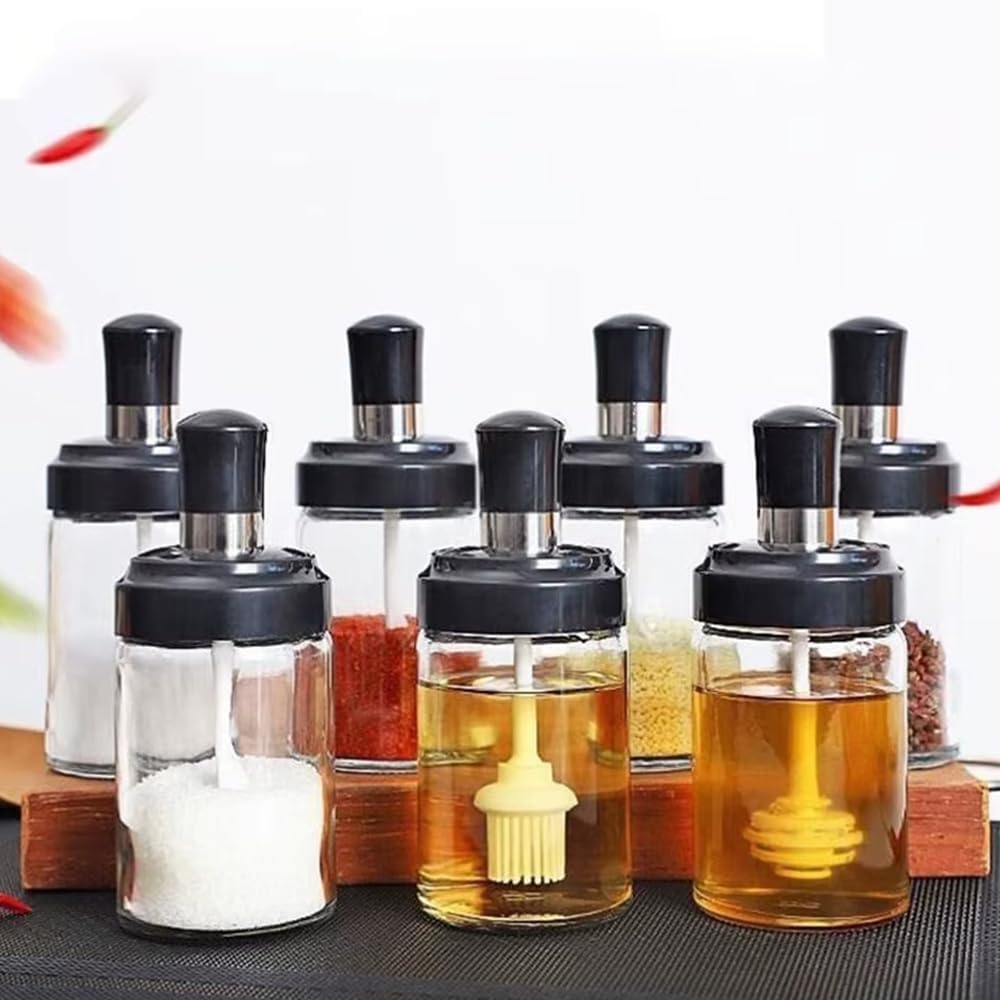 Cam Baharatlık Seti, 6'lı, Kendinden Fırçalı ve Kaşıklı, Bal Kavanozu, Siyah Kapaklı Set, 300 mL Baharatlık Kavanoz Ballık Seti