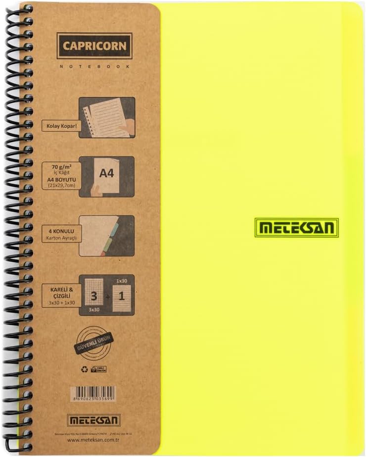 350 mikron PP (plastik) kapak 70 gr 1. hamur kağıt Pet spiralli 210 yaprak, 420 sayfa, 7 konulu (5 kareli, 2 çizgili) Türkiye'de üretilmiştir Capricorn Neon Serisi, A4, 7 Konulu (5 Kareli, 2 Çizgili) 210 Yaprak PP Kapaklı Spiralli Defter, Sarı