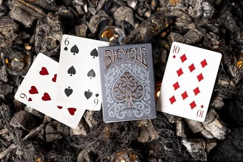 Dumanlı gri kabartmalı birinci sınıf gümüş folyolu kutu tasarımı Parlayan közleri andıran sıcak, altın renklerle basılmış özel tasarım resimli kartlar Kolay kullanım ve karıştırma için Air Cushion Finish ve güvenilir kalitesi Çevresel etkimizi sınırlandırmak için bitki bazlı mürekkepler, geri dönüştürülebilir ve sürdürülebilir şekilde ormanlaştırılmış FSC Sertifikalı kağıt lifler kullanılarak The States Playing Card tarafından ABD'de üretilmiştir Cinder Oyun Kartları