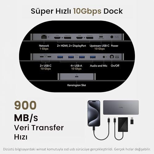 13'Ü 1 ARADA KAPSAMLI BAĞLANTI: Tek bir USB-C bağlantısıyla dizüstü bilgisayarınızı tam teşekküllü bir iş istasyonuna dönüştürün. 2x HDMI 2.0, 2x DisplayPort 1.2a, 100W PD destekli upstream USB-C, 2x 10Gbps USB-C, 4x 10Gbps USB-A, Gigabit Ethernet ve 3.5mm ses/mikrofon jakı ile tüm cihazlarınızı aynı anda bağlayın. ÇİFT 4K 60HZ EKRAN ÇIKIŞI: DisplayLink teknolojisi sayesinde, M1/M2/M3 çipli 'ların tek ekran sınırlamasını aşarak iki harici monitöre kadar 4K çözünürlükte ve akıcı 60Hz yenileme hızında görüntü aktarın. Yaratıcı profesyoneller, veri analistleri ve çoklu görev kullanıcıları için mükemmel üretkenlik artışı sağlar. 100W POWER DELIVERY İLE GÜÇLÜ ŞARJ: Dahili 150W güç adaptörü sayesinde, dizüstü bilgisayarınızı 100W'a kadar güçle hızlı ve verimli bir şekilde şarj edin. Aynı zamanda bağlı olan diğer USB-C ve USB-A cihazlarınıza da (toplamda 28W'a kadar) güç sağlayarak masanızdaki kablo karmaşasını ortadan kaldırın. YILDIRIM HIZINDA VERİ AKTARIMI: Tüm USB-A ve USB-C portları, USB 3.2 Gen 2 standardını destekleyerek 10Gbps'ye varan veri aktarım hızları sunar. Harici SSD'lerden, flash belleklerden ve diğer çevre birimlerinden büyük dosyaları saniyeler içinde aktarın ve iş akışınızı hızlandırın. EVRENSEL UYUMLULUK VE SAĞLAM TASARIM: Windows, macOS, ChromeOS ve Ubuntu dahil olmak üzere çok çeşitli işletim sistemleriyle sorunsuz çalışır. Alüminyum CNC işleme ile üretilmiş şık ve dayanıklı kasası, ısıyı verimli bir şekilde dağıtarak yoğun kullanımda bile optimum performans sağlar. Cudy CS700 13'ü 1 Arada USB-C Docking Station, Çift Monitör 4K@60Hz, 2x HDMI, 2x DisplayPort, 10Gbps USB-C ve USB-A Portları, 100W PD Şarj, Gigabit Ethernet, DisplayLink, ve Windows Uyumlu