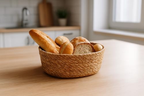 El Yapımı Hasır Ekmek Sepeti, Yıkanabilir Bez Astarlı Çok Amaçlı Oval Sunum ve Dekoratif Saklama Sepeti, Ekmeklik (22x16x8 cm)