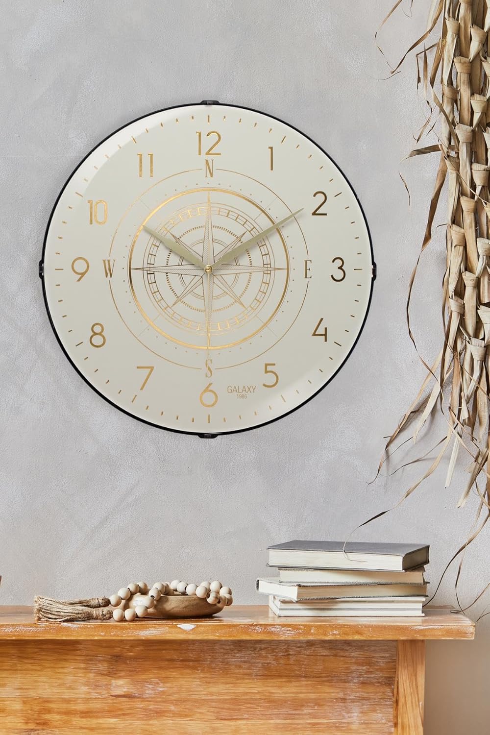 Exclucive Compass Serisi Bombeli Cam Yaldızlı Ev ve Ofis Duvar Saati 35 cm Krem