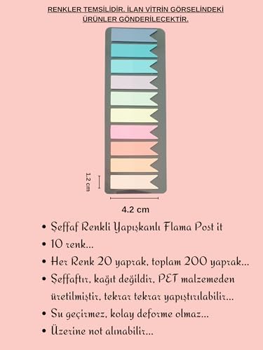 10 Renk Toplam 200 Yaprak Şeffaf Su geçirmez, Kolay yırtılmaz, Deforme olmaz Üzerine not alınabilir Tekrar yapıştırılabilir Ezoshop Sticky Notes Şeffaf Renkli Yapışkan Not Kağıtları FLAMA