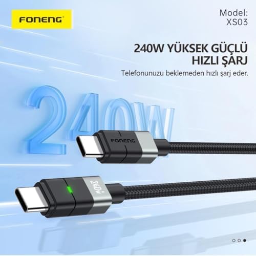 Zamandan Tasarruf Etmek İçin Hızlı Şarj 240W hızlı şarj, bekleme süresini azaltmanıza olanak tanır Akıllı çip, optimum gücü otomatik olarak sağlar Foneng Xs03 Serisi kablo, tüm USB-C özellikli cihazlar için uygundur Uzun dayanıklılık için sekiz iç bakır telli örgülü dış Foneng XS03 240W 200 cm PD Type-C Şarj Kablosu Siyah