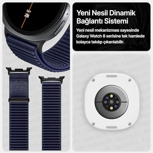 Uyumlu Modeller: Galaxy 8 40mm/44mm, Galaxy 8 46mm ile mükemmel bir uyum sağlar. Dinamik Bağlantı Sistemi: Yeni nesil metal bağlantı mekanizması sayesinde, Galaxy 8 serisine tek hareketle kolayca takılıp çıkarılır. Sağlam kilit yapısı saatinizi güvenle sabitlerken, pratik kullanım deneyimi sunar. Dayanıklı Tasarım: Yoğun günlük aktivitelerinizde dahi dayanıklılığıyla performansını korur. Günlük kullanımın getirdiği yıpranmalara ve ani darbelere karşı direnç gösterir, uzun ömürlü kullanım sunar. Hafif ve Yumuşak Dokulu Tasarım: Hafif, yumuşak ve esnek naylon malzeme cildinizde rahat hissettirir. Cilt dostu yüzeyi tahrişi en aza indirerek uzun süreli kullanımlarda bile konfor sağlar, gün boyu bileğinizle uyum içinde hareket eder. Renk Kalıcılığı: Kaliteli naylon kumaş malzemesi, kordonunun rengini uzun süre korur. Solma veya matlaşma gibi sorunlarla karşılaşmazsınız, saatinizin ilk günkü gibi parlak kalmasını sağlar. Stil ve Çeşitlilik: Galaxy 8 serisi ile uyumlu diğer kordon seçenekleri için mağazamızı ziyaret edebilirsiniz. Not: Görselde yer alan saat yalnızca tanıtım amaçlıdır, ürüne dâhil değildir. Galaxy 8 (40mm/44mm) ve 8 (46mm) ile Uyumlu Metal Bağlantılı, Hafif ve Yumuşak Kumaşlı Hasır Kordon (Lacivert)