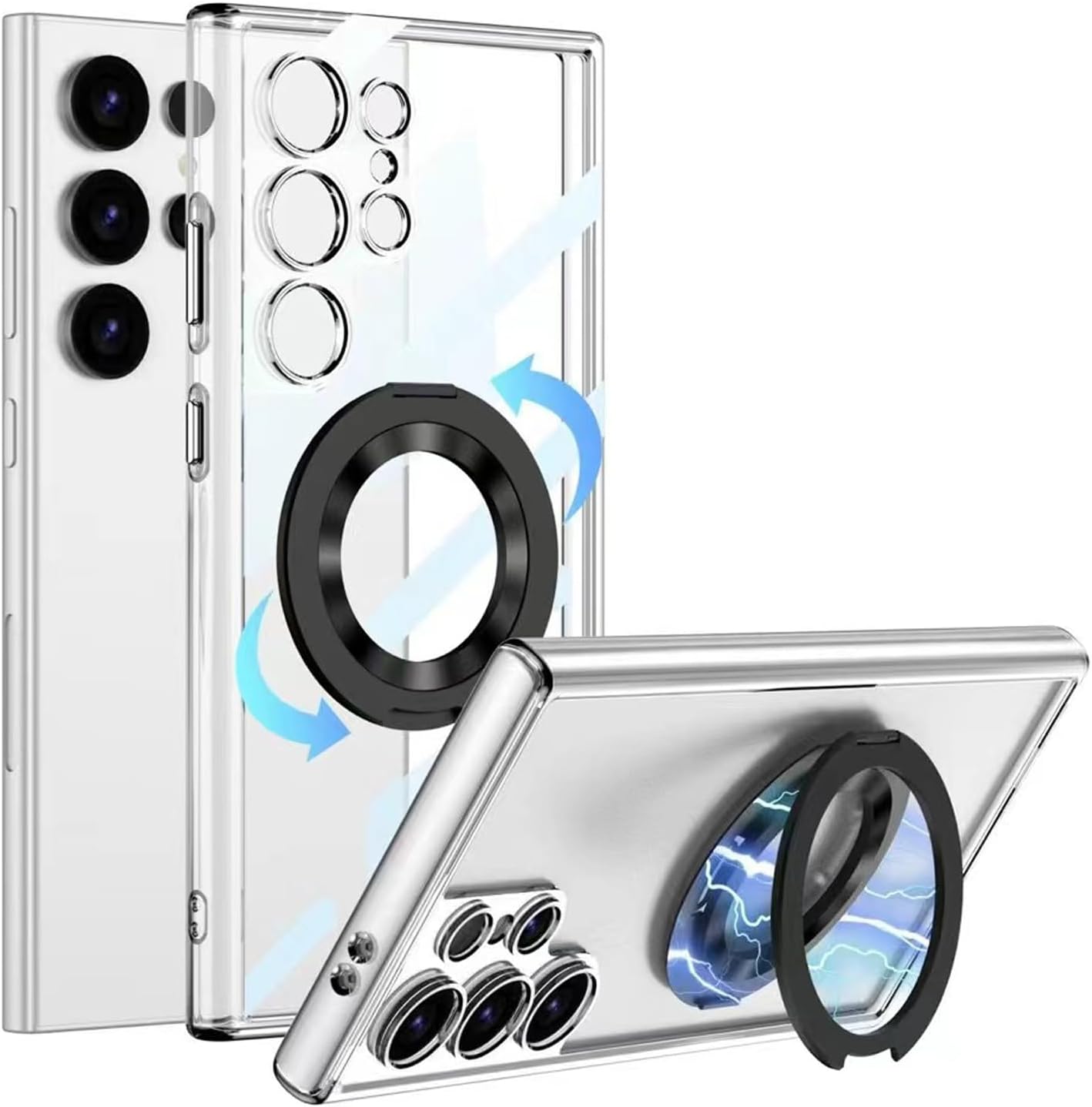 Galaxy S24 ile uyumlu Yüzük Aparatlı 360° Dönebilen Stand Özellilki MagSafe ile uyumlu Çift Katmanlı 2mm Kamera Koruma Yüksek Kalite Glamour Galaxy S24 Kapak Şeffaf
