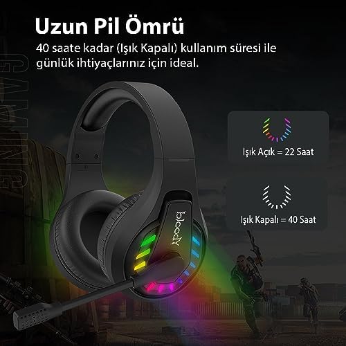 Oyunculara özel 7.1 Bluetooth&2.4G kablosuz Neon Gaming kulaklık Hepsi-bir-Arada, kablosuz gürültü engelleyici kulaklık Bluetooth v5.2 & 2.4G Kablosuz ve Kablolu ses bağlantısı (3.5mm 4pin-USB Type-C) 3.5mm 4-pin (cihazdan)-USB Type-C (kulaklığa) uçlu kablo bağlantısı ile geniş cihaz uyumluluğu 40 Saate kadar (Işıklar Kapalı) kullanım süresi ile gün boyunca ihtiyaçlarınızı karşılar. GR230 Çok Modlu (Bluetooth+2.4Ghz+Kablolu) Şarjlı Neon Kablosuz Gamer PC, PS4 ve PS5 için Oyuncu Kulaklık
