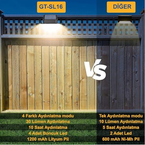 Güneş Paneli : 5.5V 0.7W Pil: 18650 Lityum İyon 3.7V 1200mAh Led Cinsi: Boncuk led Led Ömrü: 5000 Saat – Lümen: 30Lm Su Koruma Sev.: IP54 – Işık Açısı: 120° Işık Modu: Sabit ve Geçişli 8 Renk Şarj Süresi: 8 Saat – Aydınlatma Süresi: 10 Saat Çalışma Sıcaklığı: -20°C~+80°C – Malzeme: ABS Plastik Ürün Boyutu: 100x66x45 mm – Ürün Ağırlığı: 360 gr Güneş Enerjili 8 Renk Geçişli Duvar Aydınlatma (4 Adet) / GT-SL16