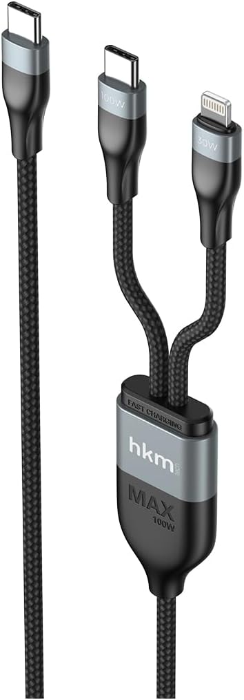 hkm tech DUO POWER 100W Çift Uçlu, Type-C to Lightning + Type-C Şarj Kablosu, Örgü Tasarım, 1.2 metre, Siyah