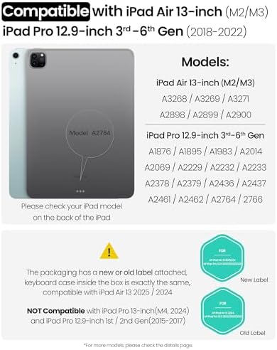 Arkadan Aydınlatmalı Klavyeli iPad Pro 12.9 ve iPad Air 13 Kılıfı – iPad Air 13 ve iPad Pro 12.9 inç 6. nesil 2022 (A2766,2764,2437), iPad Pro 12.9 inç 5. nesil 2021 (A2378,A2379,A2461,A ile uyumludur. 2462), iPad Pro 12,9 inç 4. nesil 2020 (A2229,A2069,A2232,A2233), iPad Pro 12,9 inç 3. nesil 2018 (A1876,A2014,A1895/A1983). Dikkat: Lütfen satın almadan önce model numarasını kontrol edin. (PENCIL DAHİL DEĞİLDİR) Arkadan Aydınlatmalı Klavye ve Anti-mistouch Teknolojisi İzleme Dörtgeni – Şarj edilebilir arkadan aydınlatmalı klavye, 7 arka ışık rengi ve 3 seviye parlaklık ayarına sahip 12,9 inç iPad pro kılıfı, iPad'i karanlık bir ortamda bile kolayca kullanabilirsiniz. 6. nesil klavyeli iPad pro 12.9 kılıfı, yazı yazmak için sessiz ve rahattır ve kaydırma, kaydırma ve daha fazlası için dahili yüksek hassasiyetli izleme dörtgeni. Kapsamlı Koruma – Klavyeli iPad 12.9 kılıfı, işlevsellik ve korumanın en üst düzeyde birleşimini sağlar. Dayanıklı klavye tabanı, hassas şekilde şekillendirilmiş ciltli kasası ve sürgülü kamera kapağı ile ipad pro 12.9 klavye kılıfı, kullanım sırasında iPad'iniz için benzersiz koruma ve gizlilik sunar. Çeşitli Açı ve Çıkarılabilir Klavye – iPad 12.9 Pro klavye kılıfı, görevlerinizle mükemmel uyum sağlamak için birden fazla eğim açısı sağlayan esnek bir destek ayağı da dahil olmak üzere bir dizi etkileyici özellik sunar. Çalışırken, film izlerken veya web'de gezinirken ideal görüntüleme açısını bulabilirsiniz. Ayrıca, iPad 12.9 pro çıkarılabilir klavye 5. nesil, yazmaya gerek olmadığında sürükleyici ekran keyfi için klavyeyi çıkarmanıza olanak tanır. Otomatik Uyku/Uyandırma ve Yüksek Kapasiteli Pil – 2-3 saat tam şarjdan sonra, klavyeli ipad pro 12.9 kılıfı 6. nesil 180 gün bekleme. İPad pro 12.9 inç klavye kılıfını veya 10 dakikalık hareketsizliği kapattığınızda, klavye uykuda olacaktır. iPad Air 13 inç (M2, 2024), iPad Pro 12.9 Klavyeli Kılıf (6./5./4./3. Nesil) Klavye Kılıfı, Sihirli İzleme Pedi, Slayt Kamera Kapağı, 7 Arka Işık Renkli Çıkarılabilir Klavye, Siyah