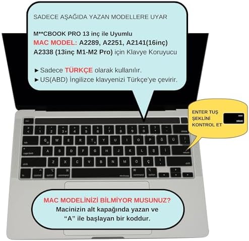 ÖZEL MCSOTREY TASARIMI – Yalnızca markası tarafından sunulan, global pazarda başka satıcısı bulunmayan özel ürün. TÜRKÇE KARAKTERLİ KLAVYE ÇEVİRİSİ – Amerikan İngilizce Q klavyeyi Türkçe Q düzene dönüştürür, eksiksiz harf seti. RETURN ENTER İLE UYUMLU – Yatay dikdörtgen “Return” Enter tuş düzenine sahip Pro modelleri için özel tasarlanmıştır. DAYANIKLI SİLİKON MALZEME – Toz, sıvı dökülmesi ve tuş aşınmasına karşı korur, ince yapısıyla yazma hissini bozmaz. TAM MODEL UYUMLULUĞU – Pro 13 inç M1/M2 (A2338), A2251, A2289 ve Pro 16 inç (A2141 – 2019) ile birebir uyumlu. Klavye Koruyucu Silikon Film US İNGİLİZCE AMERİKAN-RETURN-ENTER-İÇİN TÜRKÇE ÇEVİRİ BASKI TouchBar Pro 13-16 inç A2251 A2289 A2338 A2141 Uyumlu, Ultra İnce Yıkanabilir Siyah