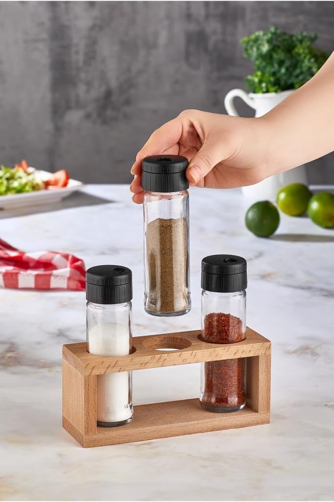 Lima 3lü Baharat Takımı Ahşap Stantlı Baharatlık Siyah Kapak