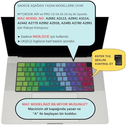 için Klavye Koruyucu Seçerken, Model numaranızı ve Klavyenizin ENTER Tipini Kontrol Ettiniz mi? ⚠️ Model Numaramı Bilmiyorum? – Cihazınızın Alt Kapağında Üst Orta Kısımda yazar Model : AXXXX ⚠️ İngilizce Klavye,UK-İngilizce, UK-ENGLİSH harf baskılı, İngilizce AB Dizayn Baskılı üründür. ⚠️ Klavyede ENTER Tuşunuz, Görseldeki ürünün ENTER Tuşu ile AYNI OLMALIDIR. ✔️ Air M2 M3 M4 13,6inç A2681 A3113 A3240 Ters L- UK Enter. ✔️ Air M2 M3 M4 15,3inç A2941 A3114 A3241 Ters L- UK Enter. ✔️ Pro M1 M2 M3 14,2inç A2442 A2779 A2918 A2992 Ters L- UK Enter. ✔️ Pro M4 14,2inç A3112 A3401 A3185 Ters L- UK Enter. ✔️ Pro M1 M2 M3 M4 16,2inç A2485 A2780 A2991 A3403 A3186 Ters L- UK Enter. M1-M2-M3 Air Pro Klavye Koruyucu (UK-EU İngilizce) TouchID'li A2681 A3113 A2941 A3114 A2442 A2779 A2992 A2918 A2485 A2780 A2991 ile Uyumlu Pembe Yeşil