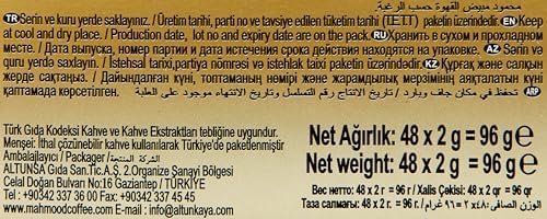 Yüksek Kalite: Granül kahve. Pratik: Hızla çözünür. Etkili Tat: Zengin aroma. 48 Adet: Uzun kullanım. Mahmood Coffee Gold Granül Kahve 2 Gr x 48 Adet