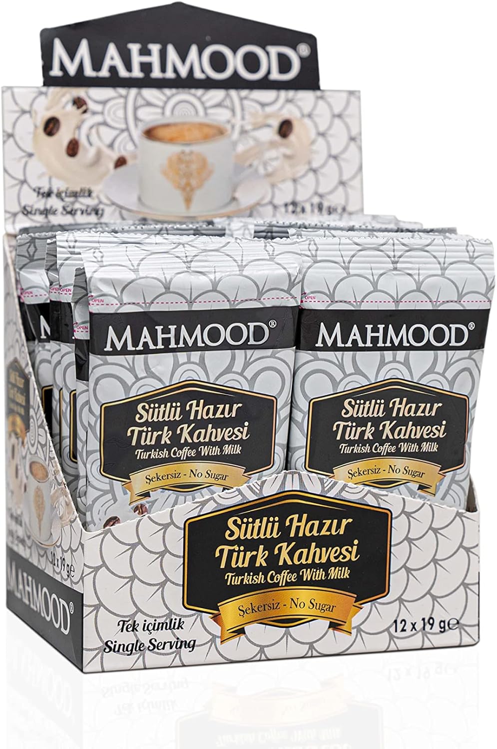 Ürün ambalajı farklılık gösterebilir Hijyenik ve Güvenilir Doğal Bileşenler Mahmood Coffee Hazır Türk Kahvesi Sütlü Şekersiz (19 Gr x 12 Adet)