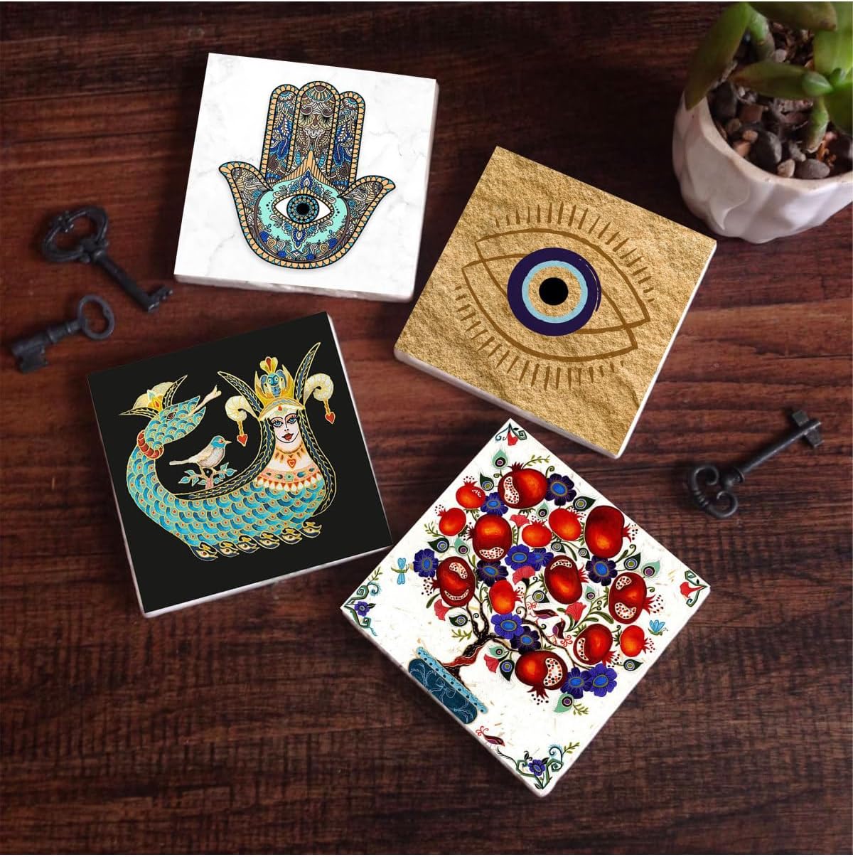 Nazar, Şahmeran, Nar Ağacı, Fatma Ana Eli Taş Bardak Altlığı Seti – 4 Parça – Dekoratif, Rustik Mutfak Aksesuarı, 10×10 cm, Kaydırmaz Tabanlı, Şık ve Dayanıklı SC506