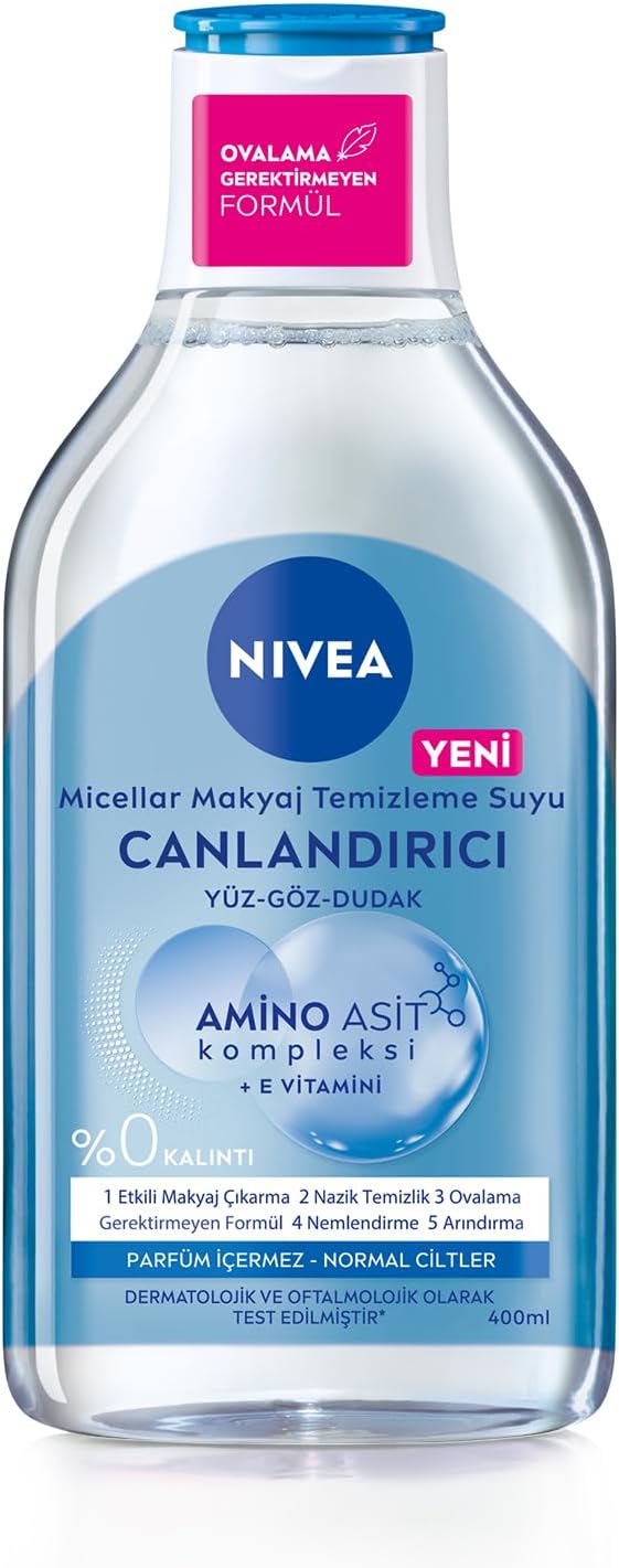 NIVEA 5IN1 Micellar Makyaj Temizleme Suyu, normal ciltlere özel formülü ile makyajı derinlemesine ve etkili şekilde çıkarır Cildin ilk koruma katmanı olan microbiome ile dengeli şekilde çalışır Makyajınızı nazikçe derinlemesine temizler ve etkili şekilde çıkarır Kalıntı bırakmadan cildinizi temizler, kurutmadan bakım yaparak yumuşacık ve canlı olmasını sağlar Canlandırıcı etkisiyle cildiniz için tam bakım sağlar Normal ciltler için uygundur NIVEA 5in1 Canlandırıcı Micellar Makyaj Temizleme Suyu Normal Ciltler, 400 ml, Yüz Temizleyici
