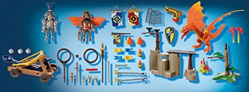 Hareketli gövde parçalarına ek olarak, set çıkarılabilir bir top içerir ve figürler ejderhaya binebilir Ejderha ayrıca kanatlarında nesneler tutabilir ve figürler üzerine binebilir Etrafında hareket eden tekerleklere sahip mancınığı olan 1 fonksiyonel mancınık 2 Playmobil figürü ve 1 ateşli ejderha ile birlikte gelir Novelmore serimizin bir parçasıdır 4 yaşından büyük çocuklar için uygundur Novelmore 71210 Novelmore ve Burnham Raiders – Turnuva sahası, 4 yaşından büyük çocuklar için oyuncak