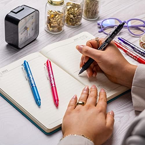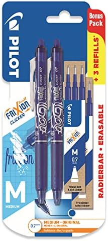 Yüksek kaliteli Pilot Frixion Clicker, 0,7 mm uç ile 0,35 mm çizgi genişliği sağlar. Orijinal termal duyarlı mürekkep, entegre silgi, ergonomik sap ve yeniden doldurulabilir. Silgiyle ovalayarak hataları giderin ve mürekkebin kaybolmasını izleyin. Bu set, 2 adet mavi mürekkepli kalem ve 6 yedek mürekkep kartuşu içerir. PILOT Frixion Clicker – Geri Çekilebilir Silinebilir Jel Mürekkep Kalemleri – Mavi Mürekkep – Orta 0,7 mm Uç – Blister 2'li Paket + 6 Bonus Yedek