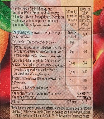 Meyve suyu oranı en az %10'dur. 100mL'si 38kcal'dir. Pınar Meyveli İçecek Akdeniz 1L x 12 adet