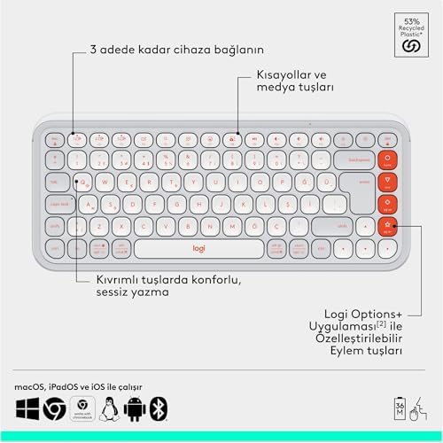 Bir POP ile başlayın: Cesur tasarımlı, kompakt ve özelleştirilebilir, Eylem Tuşları içeren bu şık Bluetooth klavye ve fare setiyle öne çıkın ve tarzınızı ortaya koyun, Farklı olmak isteyenler için tasarlandı: Bu kompakt kablosuz klavye ve fare seti sıradan dışında bir ürün; modern ve kıvrımlı tasarım geri dönüştürülmüş plastikten üretilmiştir ve eşleştirilmiş renk seçenekleriyle sunulur Sessizlik eşliğinde farkınızı ortaya koyun: Sessiz klavye konforlu yazma deneyimi için kıvrımlı ve düşük profilli tuşlara sahiptir ve sessiz fare ekstra sessiz çalışması için Silent Teknolojisinden yararlanır, Kısayollarla hayat daha kolay: İş, sosyal ve mola (Netflix, Spotify) modları arasında geçiş yapın veya Eylem Tuşları ve Logi Options+ Uygulaması ile yapay zeka araçlarınıza erişin Üç cihaz arasında kolayca geçiş yapın Farklı işletim sistemlerini (Windows, macOS, iPadOS, iOS, ChromeOS) kullanan üç adede kadar kablosuz cihaza Bluetooth ile bağlanın Easy-Switch tuşuna basarak bu cihazlar arasında geçiş yapın POP Mouse'un SmartWheel özelliği ile hızlı gezinme, Tek hareketle yüksek hassasiyetli izlemeden hızlı kaydırmaya geçiş, Belgeler ve web sayfaları arasında kolay gezinme imkanı Uzun pil ömrü: Kablosuz fare iki yıl, klavye üç yıl pil ömrü sunar, Otomatik uyku modu: Her iki cihazda da güç tasarrufu sağlayan otomatik uyku modu bulunur, Piller dahil: Ürün kutusunda piller yer alır, Geri dönüştürülmüş malzeme: POP Combo'daki plastik parçalar, rengine bağlı olarak %37 ile %70 arası geri dönüştürülmüş plastik içerir, Sorumlu ambalaj: FSC sertifikalı kağıt kullanılır POP ICON COMBO Kablosuz Klavye ve Mouse Seti, Bluetooth, Konforlu Tasarım, Programlanabilir Tuşlar, Sessiz Tıklamalar, 3 Cihaza Kadar Easy-Switch, Türkçe Q Klavye, Beyaz