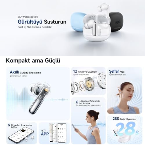 Aktif gürültü engelleme özelliği ile çevresel sesleri azaltarak dinleme deneyimi sunar12 milimetre biyo-fiber diyafram sürücü ile bas, orta ve tiz sesleri dengeli şekilde iletirBluetooth 5.4 teknolojisi ile 10 metre menzilde kablosuz bağlantı sağlar30 saat toplam kullanım süresi (gürültü engelleme kapalı), 18 saat kullanım süresi (gürültü engelleme açık)Tek şarj ile gürültü engelleme kapalıyken altı saat, gürültü engelleme açıkken dört saat kullanım sunar IPX4 su dayanıklılık standardı ile ter ve su sıçramalarına karşı koruma sağlarHFP, A2DP ve AVRCP profilleri ile cihaz bağlantısı ve düşük gecikme özelliği sunarErgonomik yapısı ile uzun süreli kullanıma uygun tasarıma sahiptirUSB-C bağlantı noktası ile şarj özelliği sunar QCY Melobuds N50 Anc Ht12 6 Mikrofonlu Bluetooth 5.4 Kulaklık Siyah