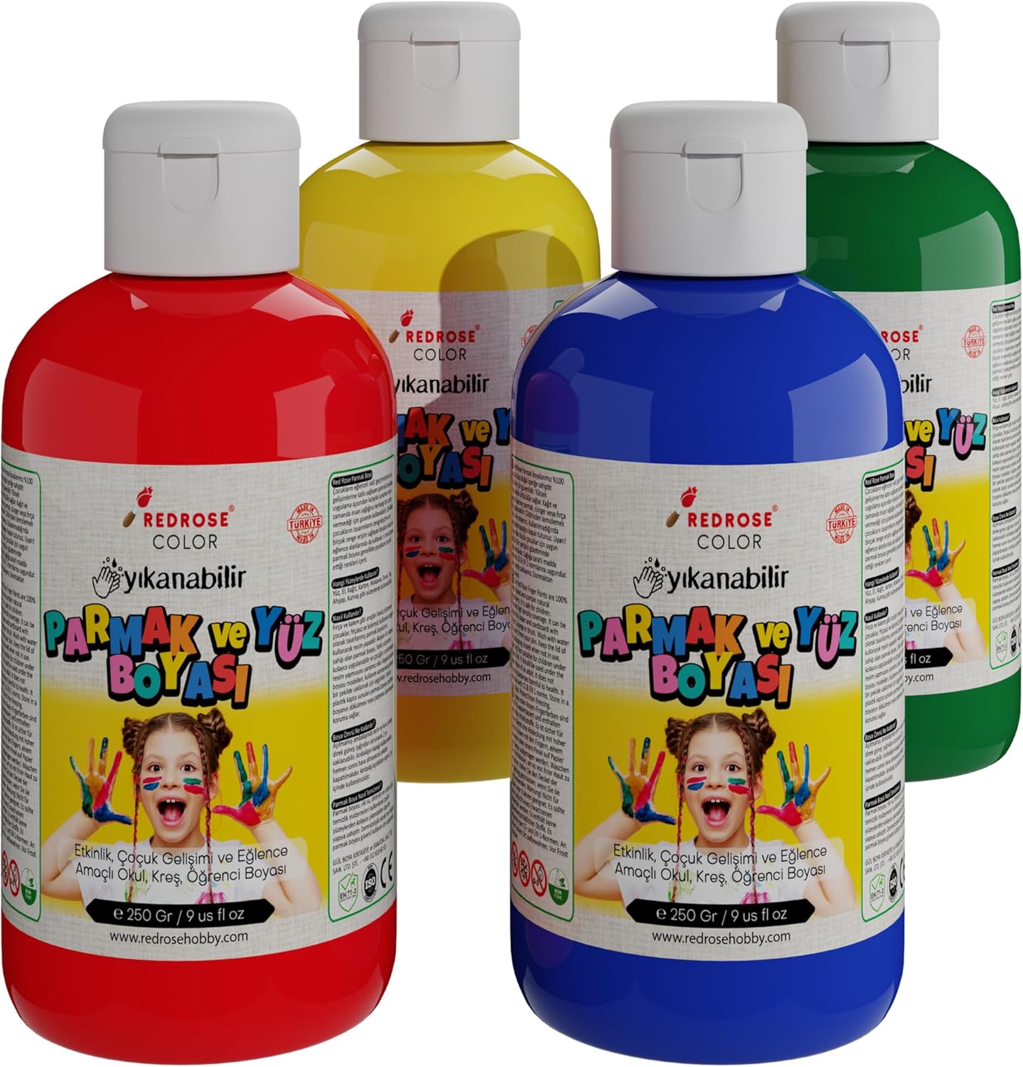Dayanıklı yapısıyla uzun süre kullanılabilir Red Rose Ana Renkler Parmak Boyası 4'lü Set 4×250 gr