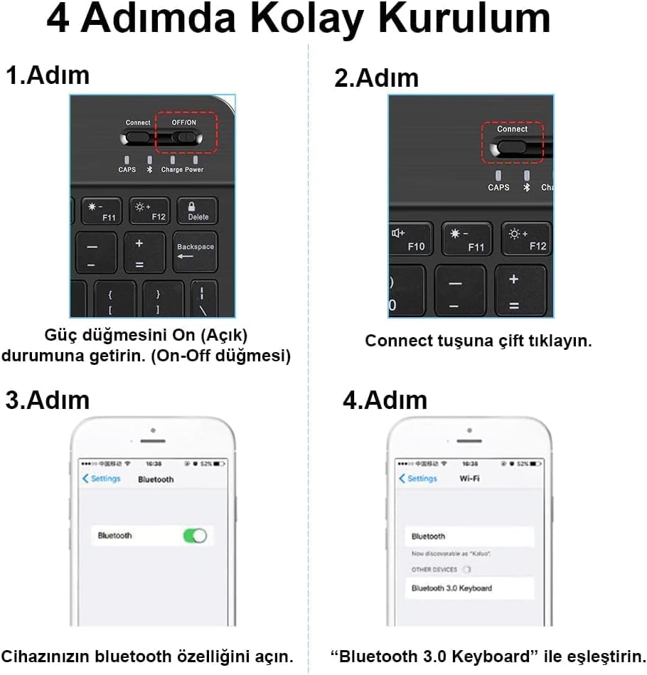 ŞARJ EDİLEBİLİR BATARYA İLE UZUN KULLANIM: Kablosuz klavye ve mouse, USB kablo ile kolayca şarj edilir ve uzun pil ömrü sayesinde sık şarj derdini ortadan kaldırır. Enerji tasarruflu yapısıyla gün boyu kesintisiz kullanım sunar. GENİŞ BAĞLANTI SEÇENEĞİ: Bluetooth 3.0 teknolojisi sayesinde, iOS ve Windows tabletlerden akıllı telefonlara, dizüstü bilgisayarlara kadar birçok cihazla anında eşleşir. Evrensel uyumluluk sunar. KOLAY KURULUM, HIZLI EŞLEŞME: 4 adımda kolay kurulum sayesinde teknolojiye hâkim olmasanız bile dakikalar içinde kullanıma hazır. Connect tuşuyla eşleşme süreci sadece birkaç saniye sürer. HAFİF, KOMPAKT VE TAŞINABİLİR TASARIM: İnce ve minimal boyutlarıyla çantaya kolayca sığar. Ofiste, okulda, seyahatte veya dış mekanda rahatlıkla taşınabilir. Mobil hayatınıza mükemmel uyum sağlar. SESSİZ VE KONFORLU YAZIM DENEYİMİ: Yumuşak, sessiz tuş yapısıyla hem dikkat dağınıklığını önler hem de konforlu bir yazım deneyimi sunar. Sessiz mouse ile ofis, ev ve kütüphane kullanımı için idealdir. Şık Tasarımlı Bluetooth Kablosuz Klavye ve Mouse Seti |, iOS ve Windows Uyumlu | Şarj Edilebilir, Taşınabilir ve Sessiz Tuşlu Set (Beyaz)
