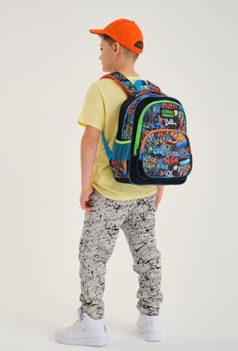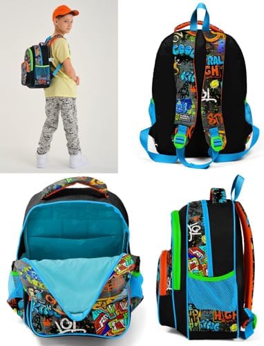 Farklı renk ve desenler ile tasarlanmıştır Çantanın yan kısımlarında 2 adet esnek file malzemeden suluk ve aksesuar cebi bulunmaktadır Üç bölmeli sırt çantası Çantanın ana gözü çift fermuar sürgüsü ile kapatılır Çantanın omuzluk bölümleri 3 ayrı katmandan oluşmaktadır Siyah Mavi Grafiti İlkokul Okul Sırt Çantası – Erkek Çocuk