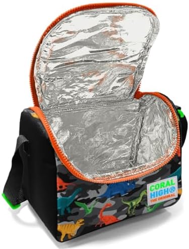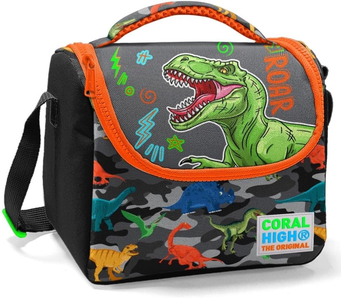Yaygan 11744 Hıgh Beslenme Çantası Çantanın fermuar bölümü daha sağlam ve güvenli olması için çift fermuar sürgüsüne sahiptir Kapağının üzerinde 25mm lik malzemeden elde tutma kulbu vardır Omuz askısı ağırlığa dayanabilecek ve kullanıcının omuz boyuna göre ayarlanmaya yardımcı olacak bir ayar tokası ile özel olarak üretilmiştir Çantanın tüm iç yüzeyi ısıya dayanıklı alüminyum izolasyon malzemesi ile kaplıdır Çantanın tüm iç izole kaplaması ile dış kumaş yüzeyi arasında 5mm kalınlığında içerideki malzemelerin ısısını koruyacak ve hassas yüklerinizi darbelere karşı korumaya yardımcı olacak köpük ile kaplanmıştır Siyah Turuncu Yeşil Dinazor Baskılı Erkek Çocuk Beslenme Çantası