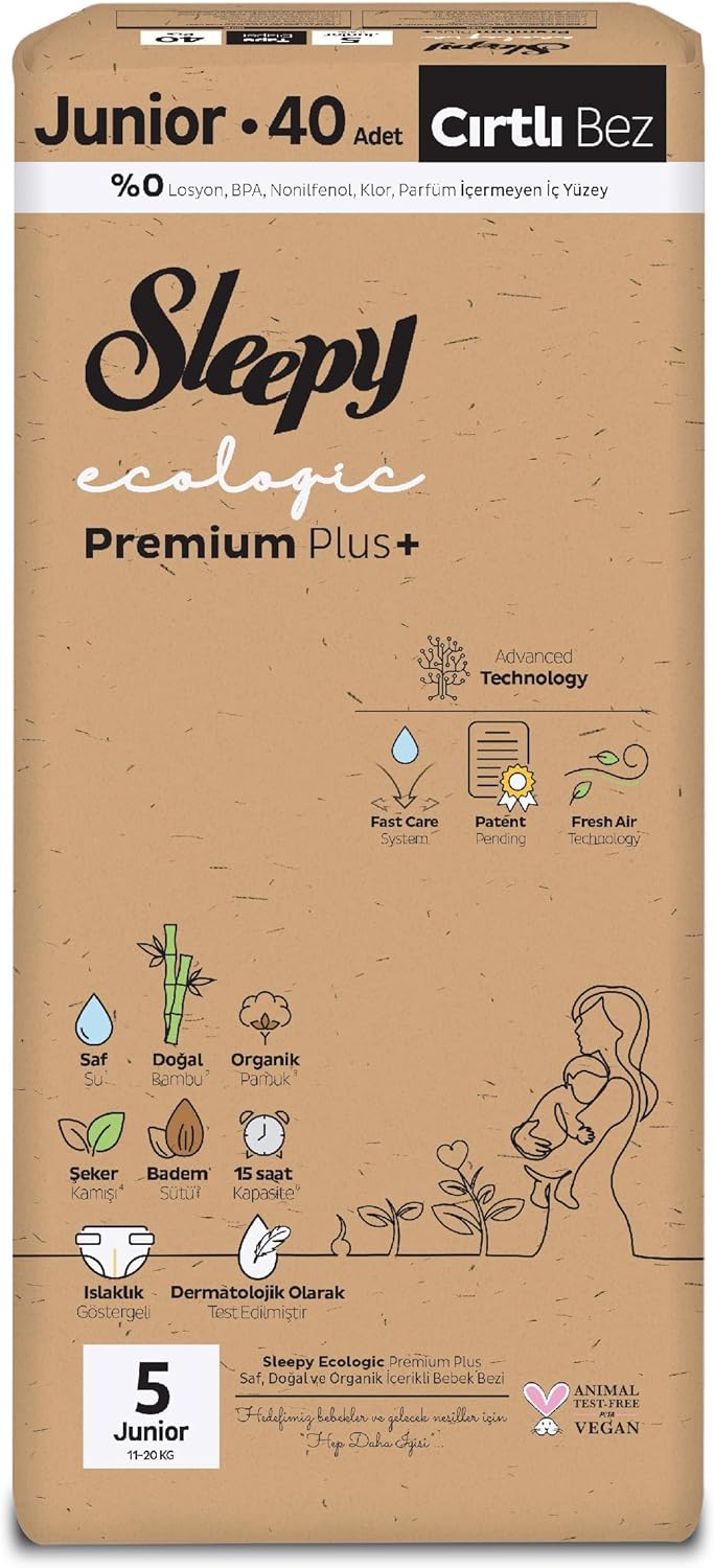 Hipoalerjenik 15 saat kapasite Islaklık göstergesi Paraben içermez Sleepy Ecologic Premium Plus Efsane Paket Bebek Bezi 5 Numara Junior 160 Adet