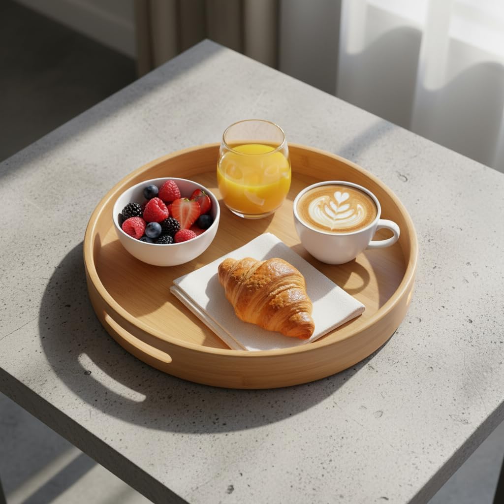 Taşıma Kulplu Yuvarlak Bambu Tepsi (30 cm) | Doğal Ahşap Servis Tepsisi | Kahve, Kahvaltı ve Dekoratif Masaüstü Organizeri